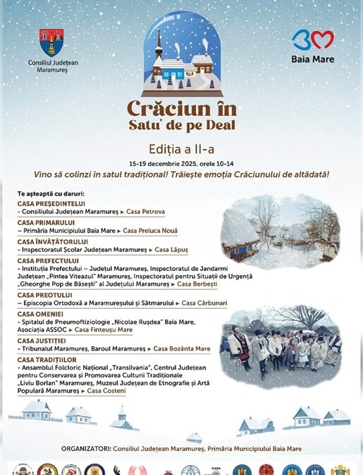 Consiliul Județean Maramureș, împreună cu Primăria Municipiului Baia Mare, anunță lansarea celei de-a doua ediții a evenimentului „Crăciun în Satu` de pe Deal”, care va avea loc în perioada 15–19 decembrie în spațiul autentic al Muzeului Satului din Baia Mare.