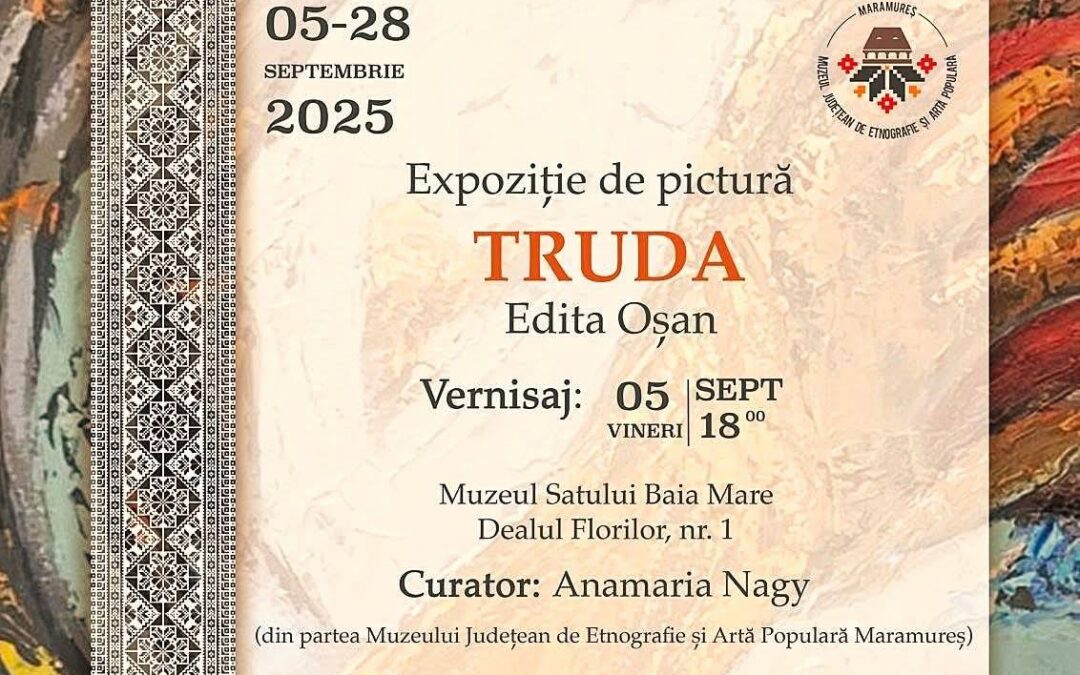 În șura Butesa, din Muzeul Satului Baia Mare, de astă dată, poposește pe simeze, până pe data de 𝟐𝟖 𝐬𝐞𝐩𝐭𝐞𝐦𝐛𝐫𝐢𝐞, prima expoziție personală, 𝑻𝒓𝒖𝒅𝒂, a artistului plastic băimărean Edita Oșan.