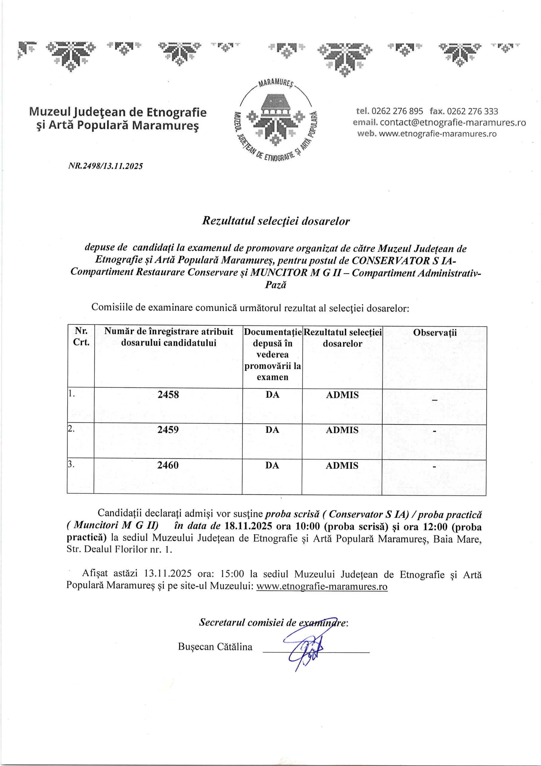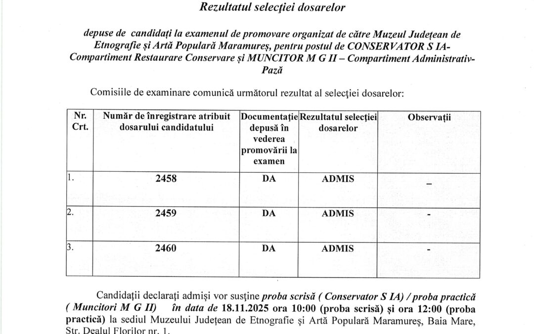 • Rezultatul selecției dosarelor – promovare conservator și muncitori-13.11.2025!