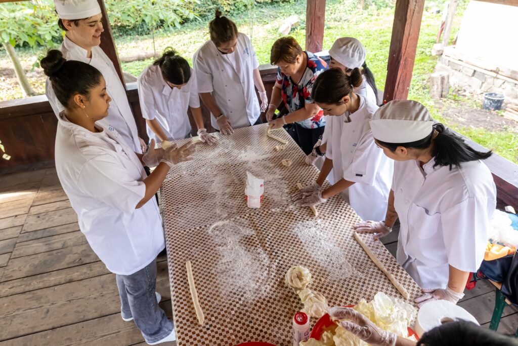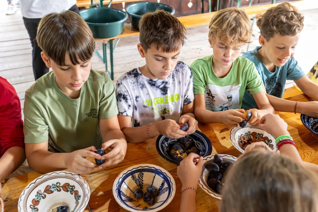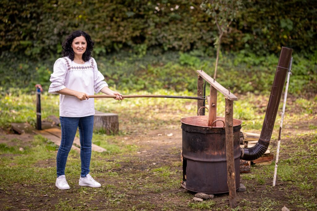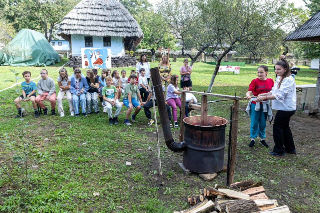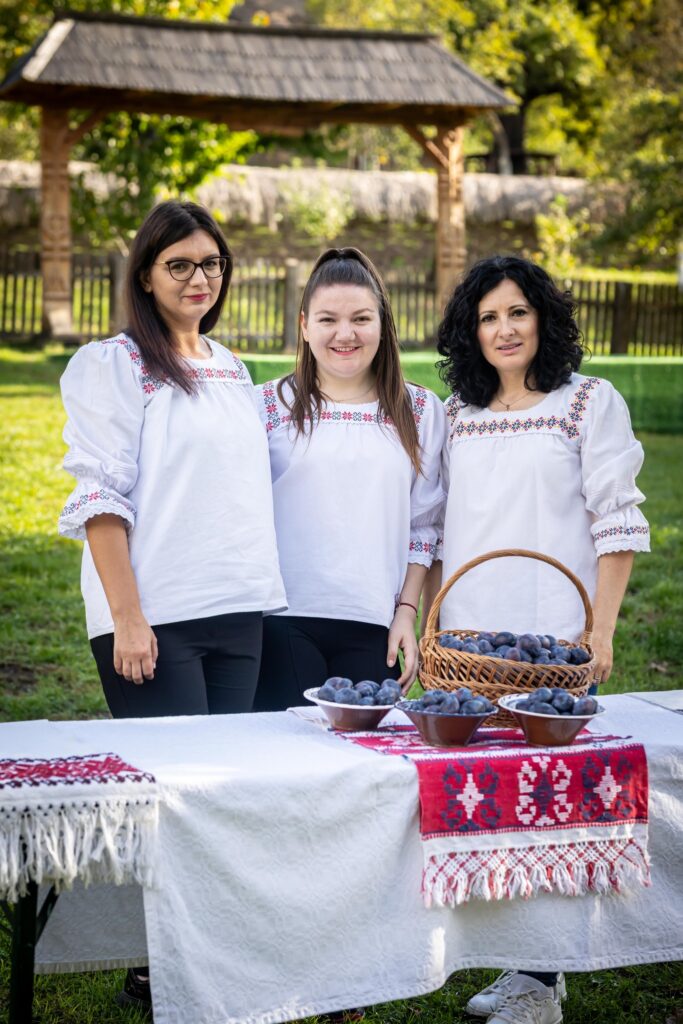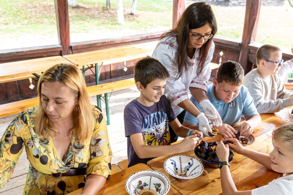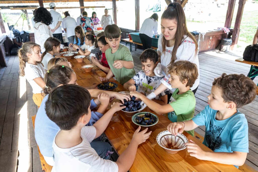 Muzeul Satului din Baia Mare s-a umplut ieri de mirosul îmbietor al silvoiței, preparate întocmai după rețeta bunicilor. Activitatea a început încă de dimineață cu pregătirea lemnelor pentru foc și spălarea prunelor, iar apoi, cu ajutorul elevilor clasei a IV-a C de la Școala Gimnazială „Avram Iancu” din Baia Mare, ne-am apucat de „dejdiocat” prunele, culese din livada colegei noastre Andra Indre, căreia îi mulțumim pentru sprijin. Îndrumați îndeaproape de către colegele noastre, elevii s-au apucat serios de treabă și cât ai clipi prunele au fost gata de pus în căldare. Focul a fost aprins, iar prunele gata „dejdiocate” s-au pus în căldarea de aramă, acolo unde, au fost învârtite mai bine de șase ore. Între timp, elevii de la Liceul „Spiru Haret UCECOM” Baia Mare – profilul alimentație au pregătit „cocuții”, pe care odată modelați, i-au așezat pe frunze de varză și i-au pus la copt în cuptorul tradițional din muzeu. După câteva ore de învârtit în căldare, printre povești, frământat și arome încântătoare, silvoița preparată în mod tradițional, fără zahăr sau alți conservanți, a căpătat consistența potrivită și a fost numai bună de degustat cu cocuții aburinzi, cu coajă crocantă. ustul desăvârșit și mirosul îmbietor ne-au purtat cu gândul la satul de odinioară al bunicilor, acolo unde, stăteam, de asemenea, până seara târziu, să degustăm bunătățile care erau ,,de pus pe iarnă”. Chiar dacă procesul de preparare al silvoiței a fost unul îndelungat, ziua de ieri a avut o importanță aparte în păstrarea acestei tradiții locale, cu un rezultat atât de apreciat și de gustos. Totodată, pentru cei care ne-au trecut pragul, activitatea a fost un bun prilej de a experimenta, de a dobândi noi cunoștințe, de a descoperi rețete tradiționale din bucătăriile rurale sau chiar de a-și aminti cu nostalgie de anii copilăriei. Vă mulțumim tuturor celor care ne-ați fost alături, echipei muzeului, ajutoarelor noastre de nădejde, partenerilor media, dar și dumneavoastră, celor care ne apreciați și ne urmăriți îndeaproape activitățile!