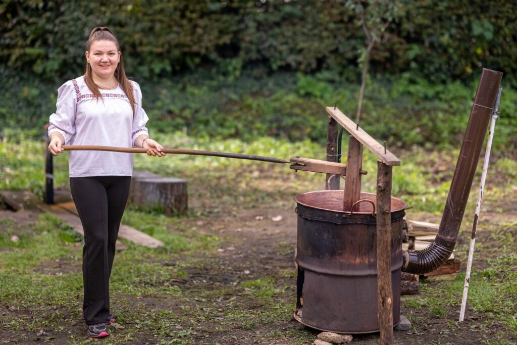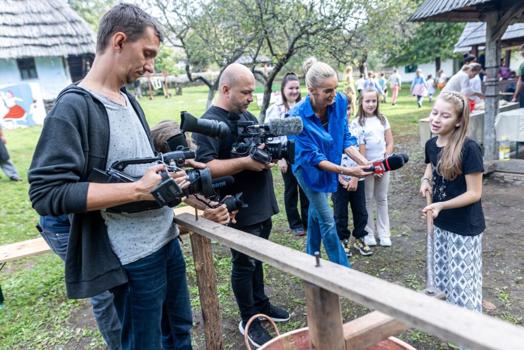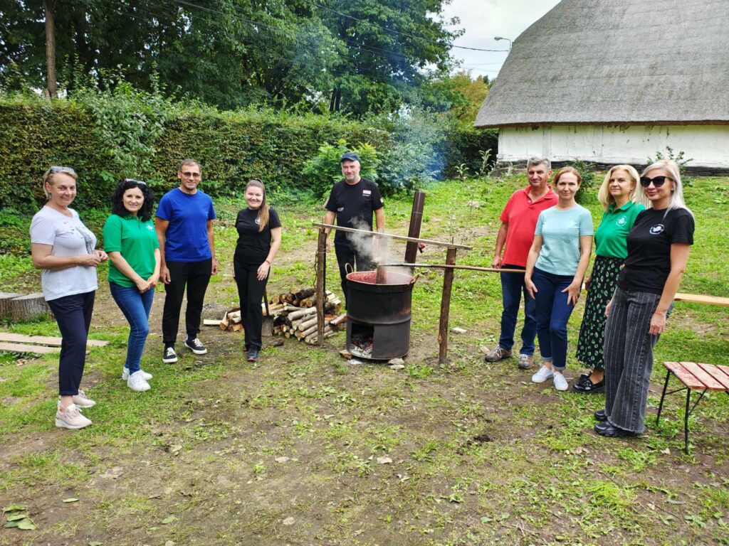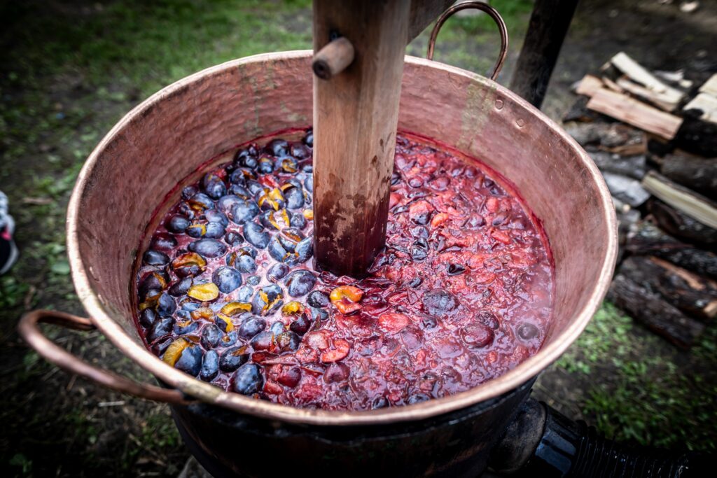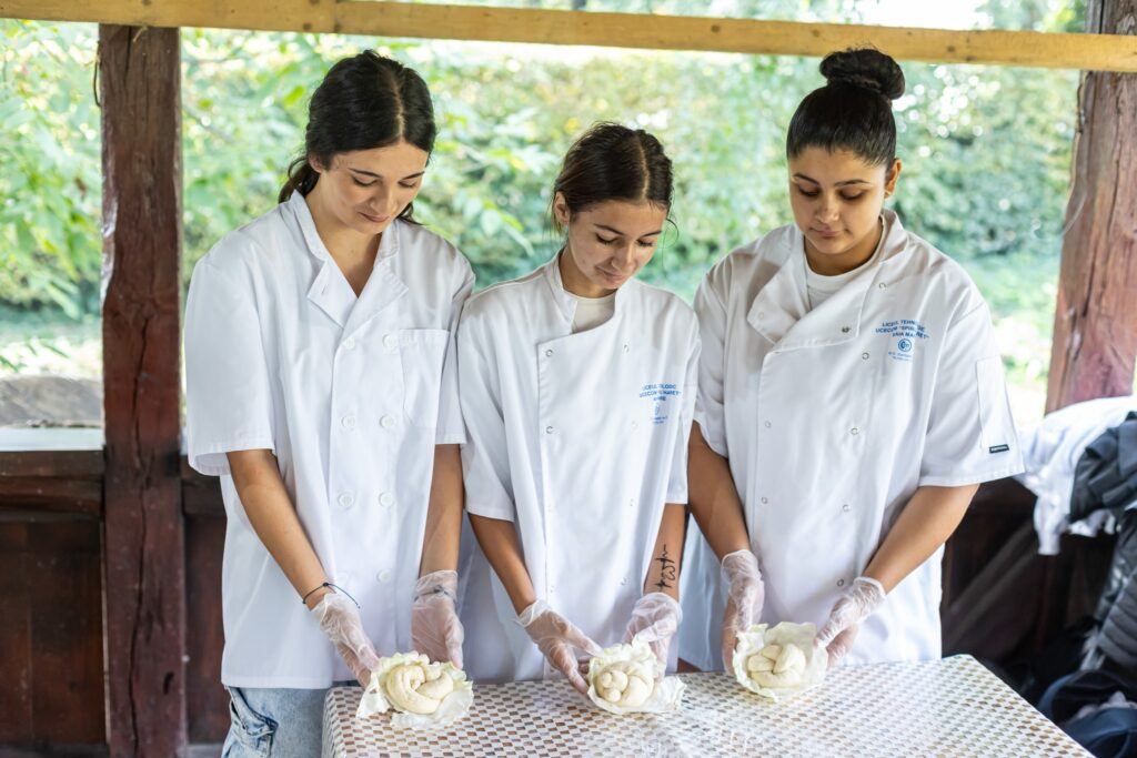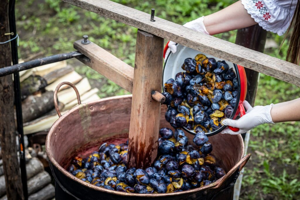 Muzeul Satului din Baia Mare s-a umplut ieri de mirosul îmbietor al silvoiței, preparate întocmai după rețeta bunicilor. Activitatea a început încă de dimineață cu pregătirea lemnelor pentru foc și spălarea prunelor, iar apoi, cu ajutorul elevilor clasei a IV-a C de la Școala Gimnazială „Avram Iancu” din Baia Mare, ne-am apucat de „dejdiocat” prunele, culese din livada colegei noastre Andra Indre, căreia îi mulțumim pentru sprijin. Îndrumați îndeaproape de către colegele noastre, elevii s-au apucat serios de treabă și cât ai clipi prunele au fost gata de pus în căldare. Focul a fost aprins, iar prunele gata „dejdiocate” s-au pus în căldarea de aramă, acolo unde, au fost învârtite mai bine de șase ore. Între timp, elevii de la Liceul „Spiru Haret UCECOM” Baia Mare – profilul alimentație au pregătit „cocuții”, pe care odată modelați, i-au așezat pe frunze de varză și i-au pus la copt în cuptorul tradițional din muzeu. După câteva ore de învârtit în căldare, printre povești, frământat și arome încântătoare, silvoița preparată în mod tradițional, fără zahăr sau alți conservanți, a căpătat consistența potrivită și a fost numai bună de degustat cu cocuții aburinzi, cu coajă crocantă. ustul desăvârșit și mirosul îmbietor ne-au purtat cu gândul la satul de odinioară al bunicilor, acolo unde, stăteam, de asemenea, până seara târziu, să degustăm bunătățile care erau ,,de pus pe iarnă”. Chiar dacă procesul de preparare al silvoiței a fost unul îndelungat, ziua de ieri a avut o importanță aparte în păstrarea acestei tradiții locale, cu un rezultat atât de apreciat și de gustos. Totodată, pentru cei care ne-au trecut pragul, activitatea a fost un bun prilej de a experimenta, de a dobândi noi cunoștințe, de a descoperi rețete tradiționale din bucătăriile rurale sau chiar de a-și aminti cu nostalgie de anii copilăriei. Vă mulțumim tuturor celor care ne-ați fost alături, echipei muzeului, ajutoarelor noastre de nădejde, partenerilor media, dar și dumneavoastră, celor care ne apreciați și ne urmăriți îndeaproape activitățile!