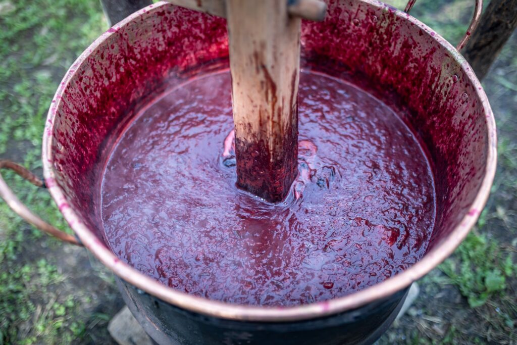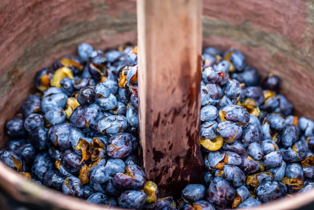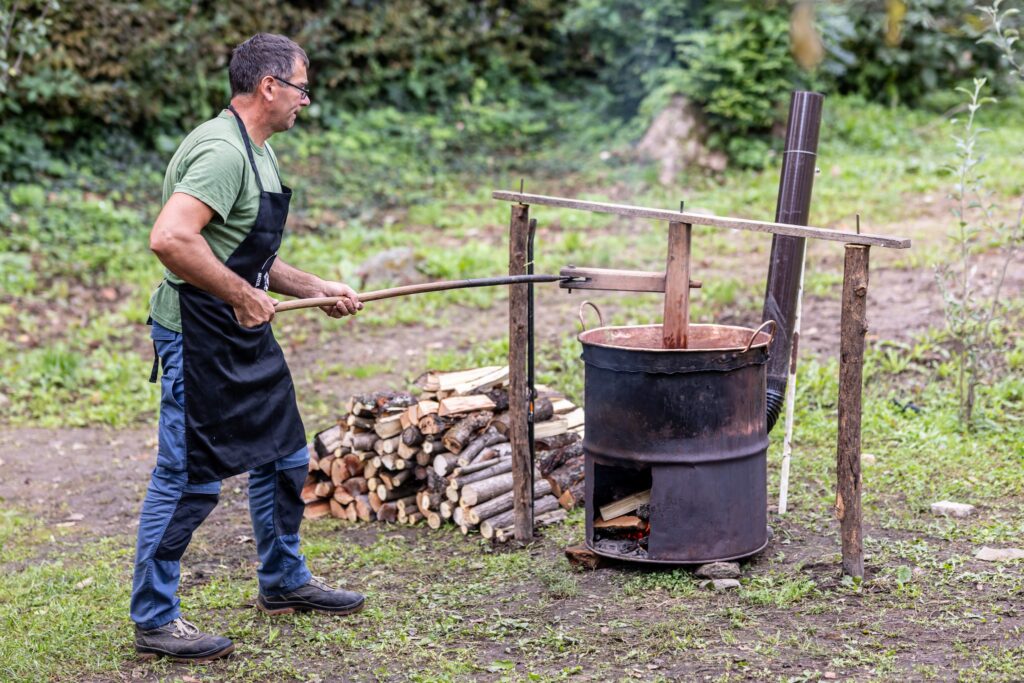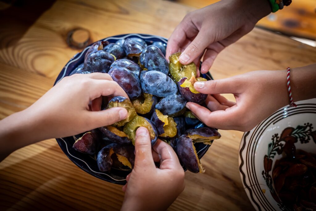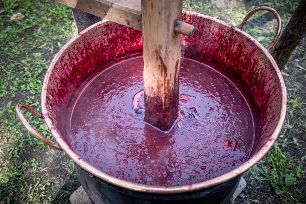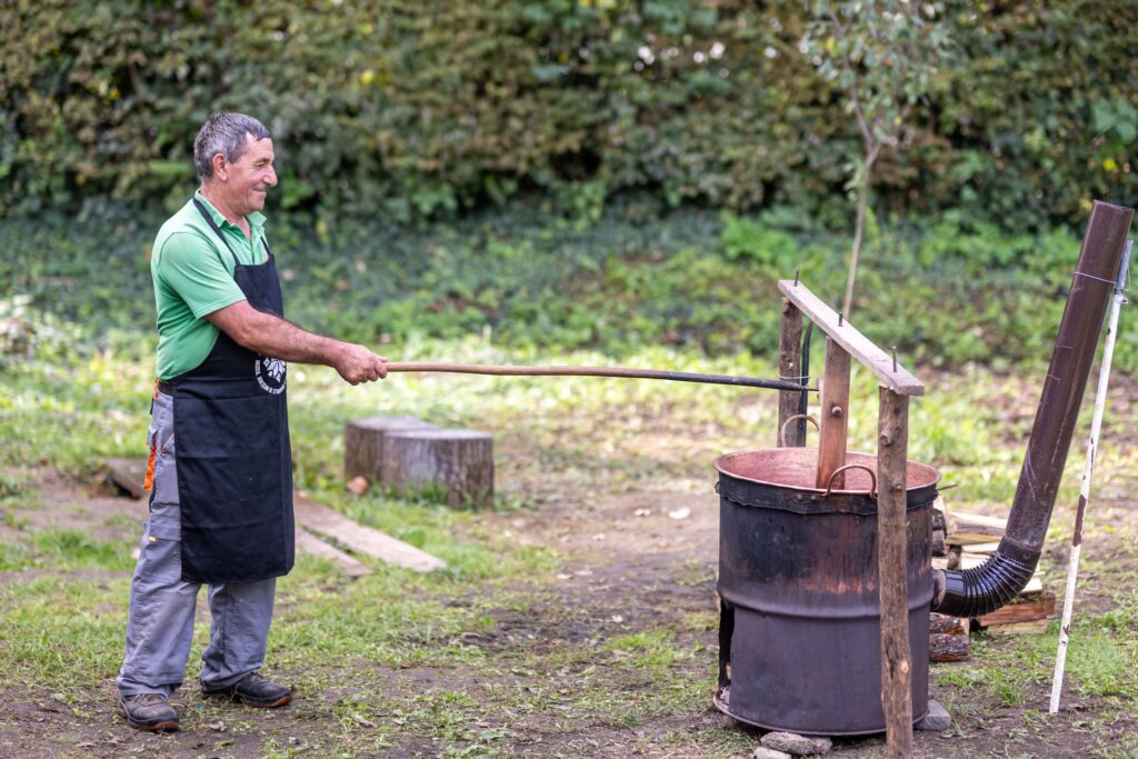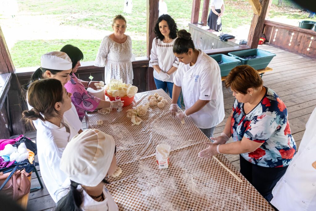 Muzeul Satului din Baia Mare s-a umplut ieri de mirosul îmbietor al silvoiței, preparate întocmai după rețeta bunicilor. Activitatea a început încă de dimineață cu pregătirea lemnelor pentru foc și spălarea prunelor, iar apoi, cu ajutorul elevilor clasei a IV-a C de la Școala Gimnazială „Avram Iancu” din Baia Mare, ne-am apucat de „dejdiocat” prunele, culese din livada colegei noastre Andra Indre, căreia îi mulțumim pentru sprijin. Îndrumați îndeaproape de către colegele noastre, elevii s-au apucat serios de treabă și cât ai clipi prunele au fost gata de pus în căldare. Focul a fost aprins, iar prunele gata „dejdiocate” s-au pus în căldarea de aramă, acolo unde, au fost învârtite mai bine de șase ore. Între timp, elevii de la Liceul „Spiru Haret UCECOM” Baia Mare – profilul alimentație au pregătit „cocuții”, pe care odată modelați, i-au așezat pe frunze de varză și i-au pus la copt în cuptorul tradițional din muzeu. După câteva ore de învârtit în căldare, printre povești, frământat și arome încântătoare, silvoița preparată în mod tradițional, fără zahăr sau alți conservanți, a căpătat consistența potrivită și a fost numai bună de degustat cu cocuții aburinzi, cu coajă crocantă. ustul desăvârșit și mirosul îmbietor ne-au purtat cu gândul la satul de odinioară al bunicilor, acolo unde, stăteam, de asemenea, până seara târziu, să degustăm bunătățile care erau ,,de pus pe iarnă”. Chiar dacă procesul de preparare al silvoiței a fost unul îndelungat, ziua de ieri a avut o importanță aparte în păstrarea acestei tradiții locale, cu un rezultat atât de apreciat și de gustos. Totodată, pentru cei care ne-au trecut pragul, activitatea a fost un bun prilej de a experimenta, de a dobândi noi cunoștințe, de a descoperi rețete tradiționale din bucătăriile rurale sau chiar de a-și aminti cu nostalgie de anii copilăriei. Vă mulțumim tuturor celor care ne-ați fost alături, echipei muzeului, ajutoarelor noastre de nădejde, partenerilor media, dar și dumneavoastră, celor care ne apreciați și ne urmăriți îndeaproape activitățile!